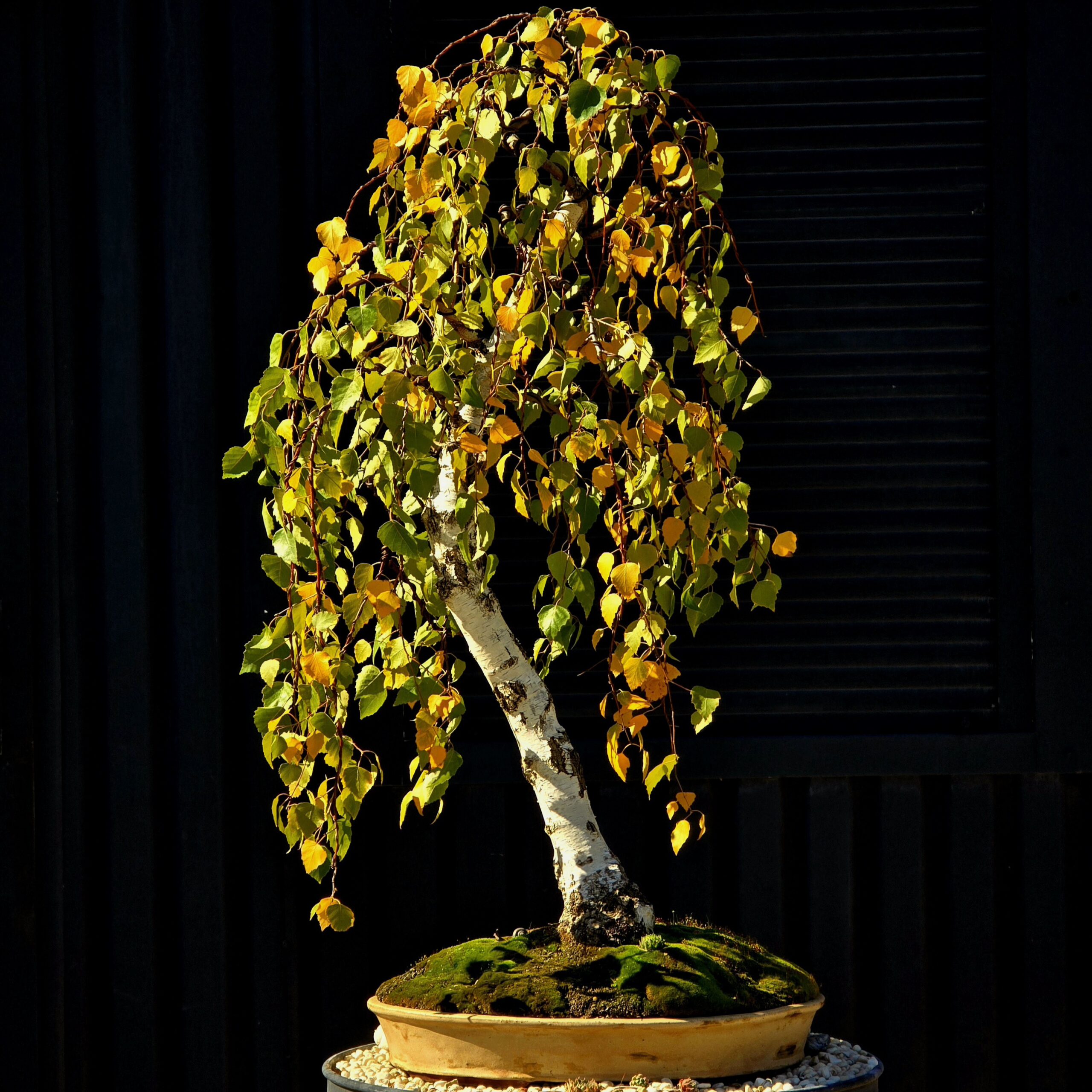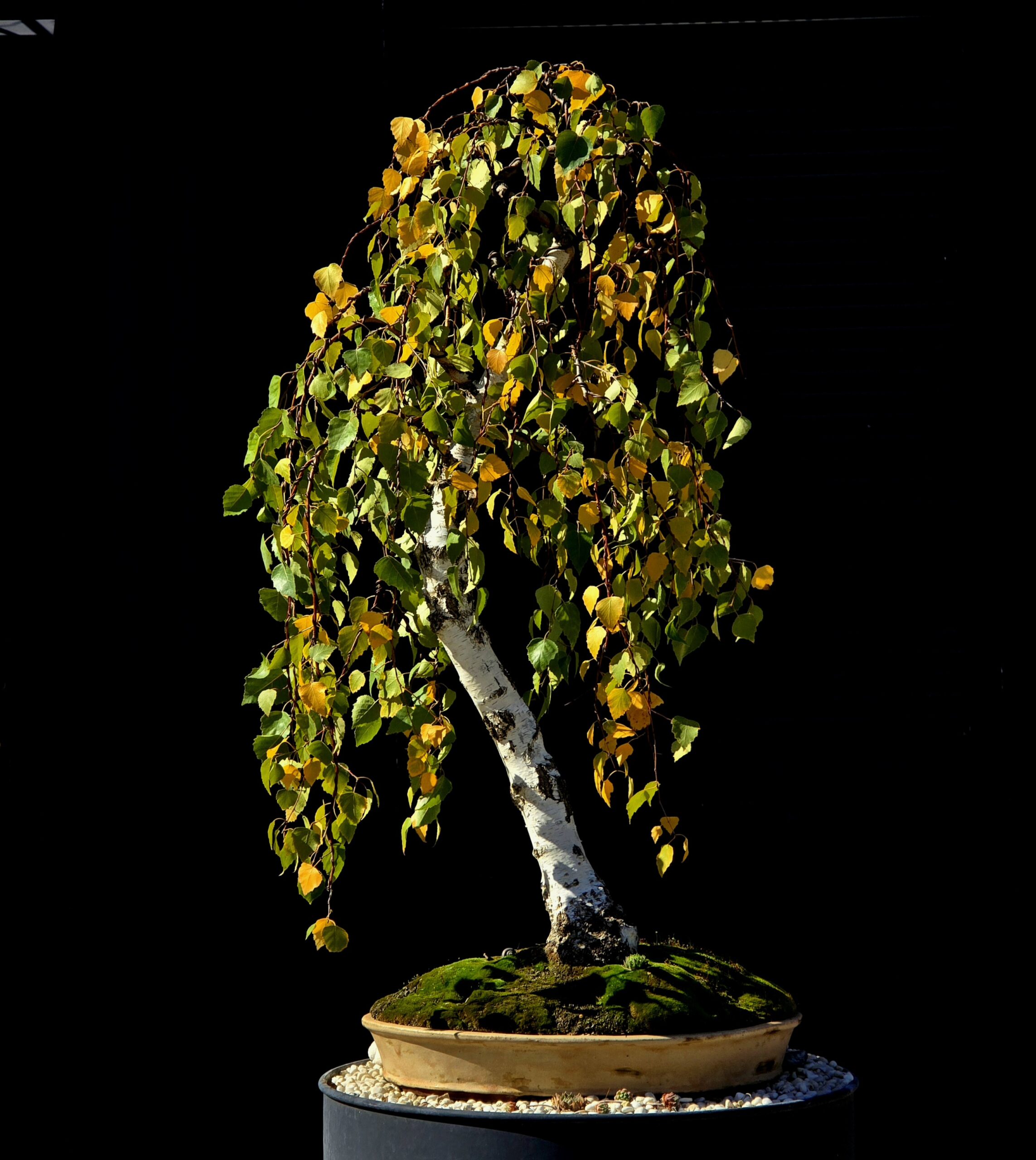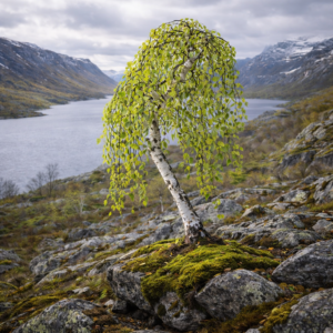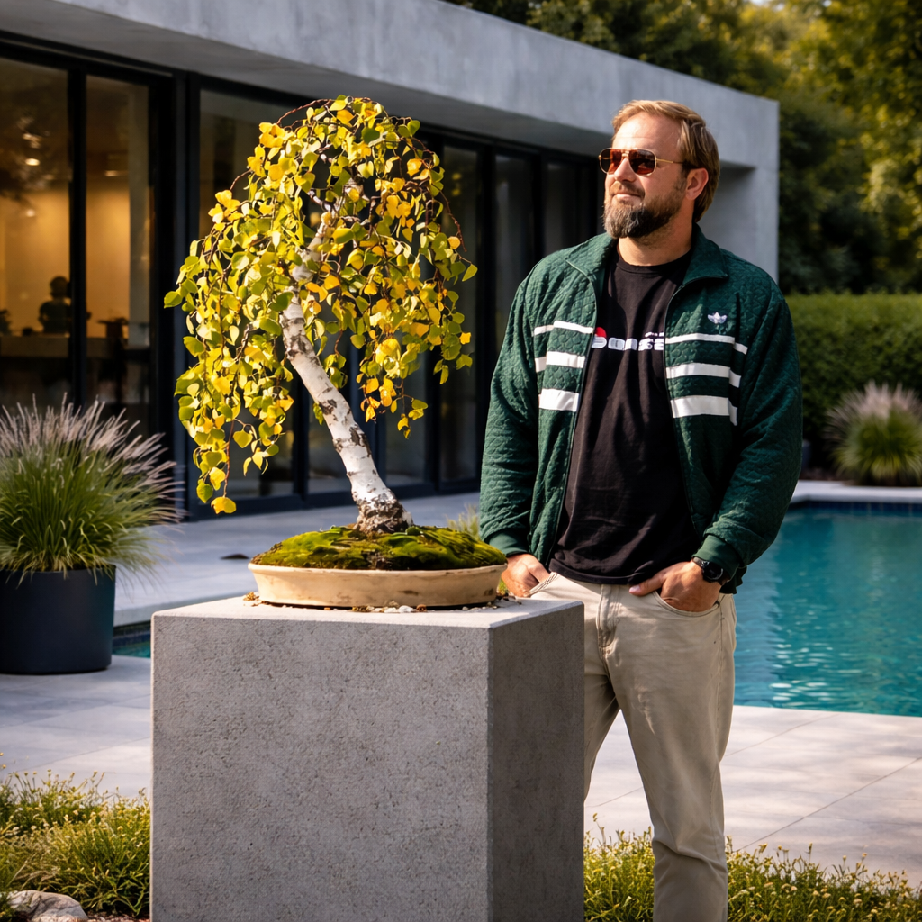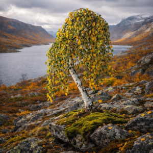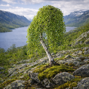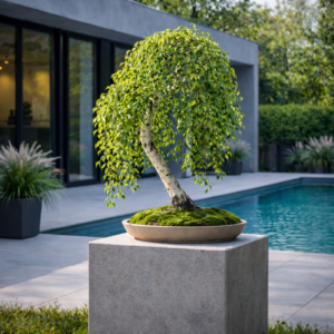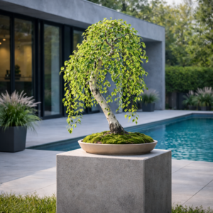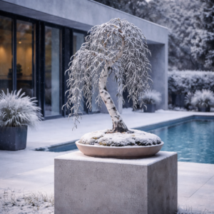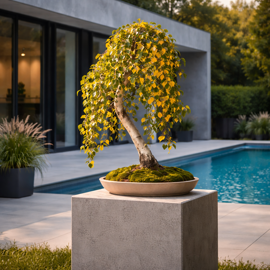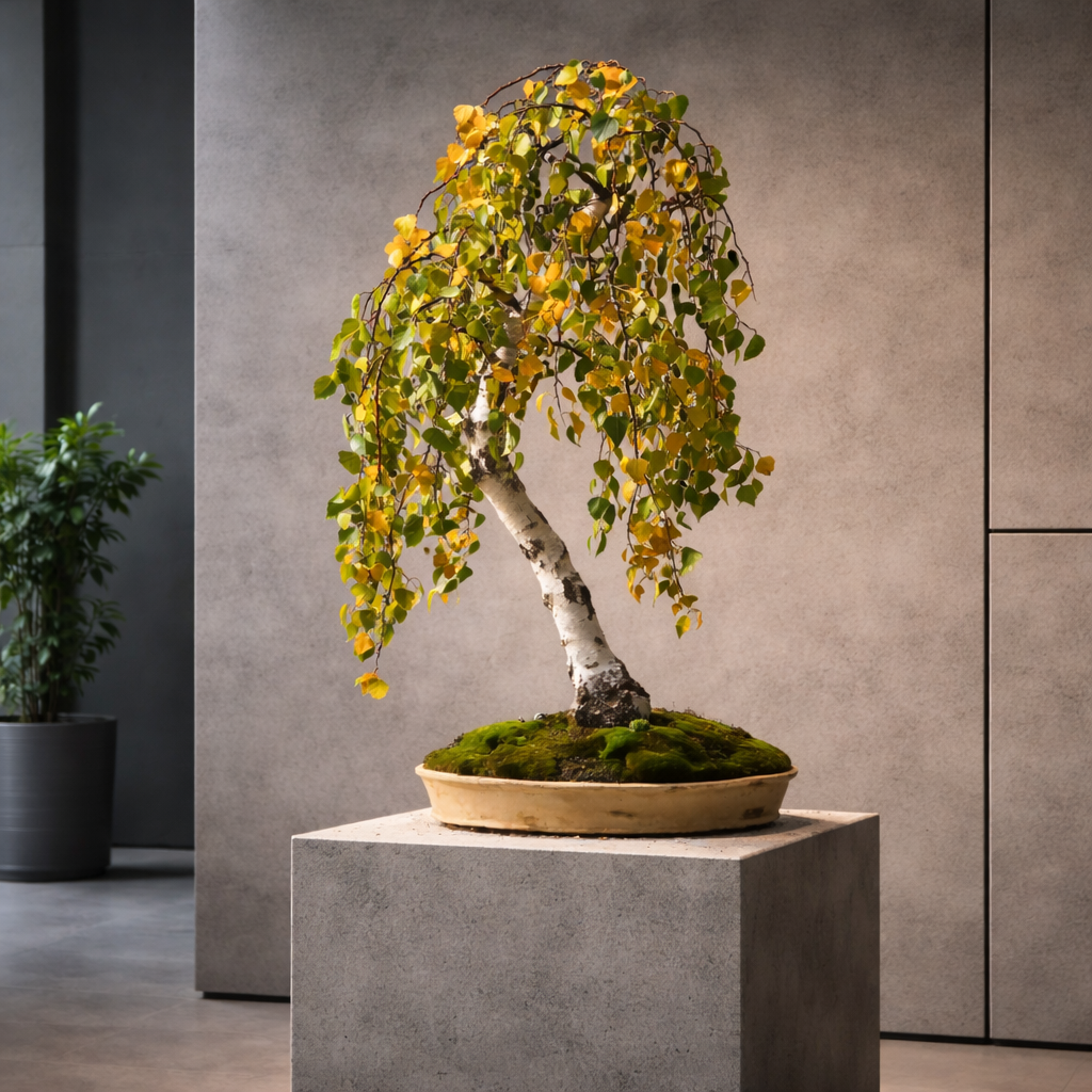Наклоненный белый ствол, плакучая крона, естественная асимметрия — все в нем говорит о реке, мохе, камнях и тишине. Дерево выглядит взрослым, сформированным, но не застывшим — оно постоянно меняется вместе с временами года.