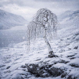 Зимой береза обнажает линию ствола. Без листьев она становится графикой – чистой, честной, спокойной. Форма читается полностью, как следует времени на камне. Это период тишины и созерцания.